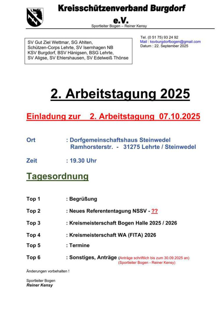 NEU -- Die 2. Arbeitstagung findet am 07.10.2025 um 19.30 Uhr in Steinwedel statt.